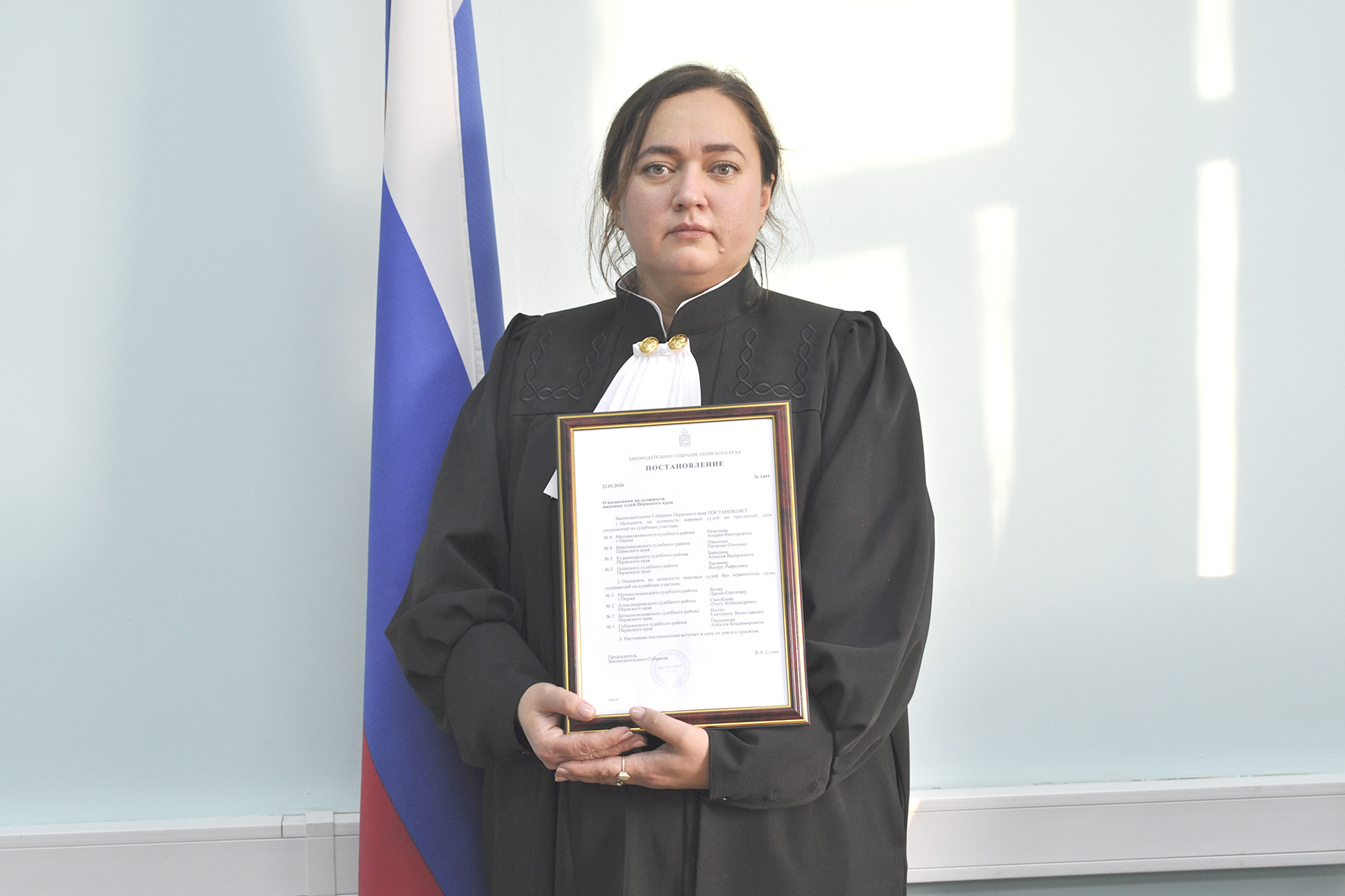Сегодня, 26 января 2026 года в Осинском районном суде Пермского края состоялось торжественное мероприятие, посвященное вступлению в должность мирового судьи Венеры Хасановой. Участие в знаменательном событии приняли прокурор Осинского района Нияз Мусабиров, прокурор Еловского района Людмила Романова, начальник МО МВД России «Осинский» Салават Сакаев, глава Осинского муниципального округа Игорь Морозов, заместитель главы Еловского муниципальногоокруга Анна Нефедова, руководитель Осинского МСО СУ СК России по Пермскому краюМаксим Дудин, врио начальника ОСП по Осинскому, Бардымскому и Еловскому районам Пермского края Наталья Молчанова, судьи и сотрудники аппарата Осинского районного суда Пермского края. Слова присяги произнесены в торжественной обстановке перед Государственным флагом Российской Федерации, положив руку на Конституцию Российской Федерации.Хасанова Венера Рафиловна назначена на должность мирового судьи судебного участка № 3 Осинского судебного района Пермского края постановлением Законодательного Собрания Пермского края от 22 января 2026 года № 1495 на трехлетний срок полномочий Председатель суда Константин Соломников вручил коллеге символы судейской власти – мантию и нагрудный знак мирового судьи Пермского края, поздравил со вступлением в должность, подчеркнув, что такое назначение свидетельствует о доверии, высокой оценке деловых и личных качеств, пожелал высоких стабильных показателей в работе. Также слова поздравления выразили приглашенные гости и коллеги, пожелали Венере Рафиловне успехов, крепкого здоровья, плодотворной и эффективной работы на благо государства и общества. С сегодняшнего дня вновь назначенный мировой судья приступила к своим должностным обязанностям отправлению правосудия на вверенном судебном участке. |